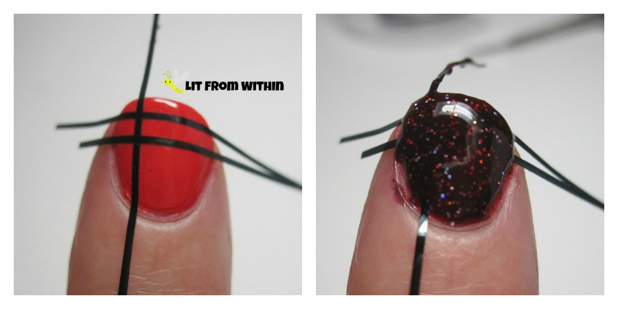 Once you’ve made sure that the base color is very, very dry, then you can apply the tape, making sure it’s stuck in all the corners of the nail. Then, cover the nail with the next color. In this nail art, I used Blue-Eyed Girl Lacquer Newborn Solstice Sun, a black and red glitter.