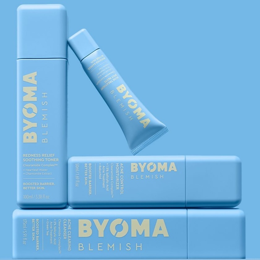 Byoma Blemish care system combines powerful blemish-fighting actives with barrier-boosting ceramides to soothe + combat breakouts while protecting and maintaining skin barrier.